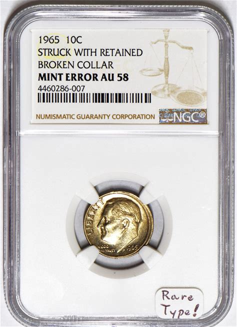 1965 Dime Struck With Retained Broken Collar Mint Error NGC AU-58 Rare Type!