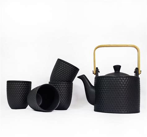 WEOPYCJ Japanese Chinese Tea Set, Asian Ceramic Tea Pot And Cups Set, Porcelain Teapot With Infuser And Wooden Handle 4 Teacup (30Oz Black)