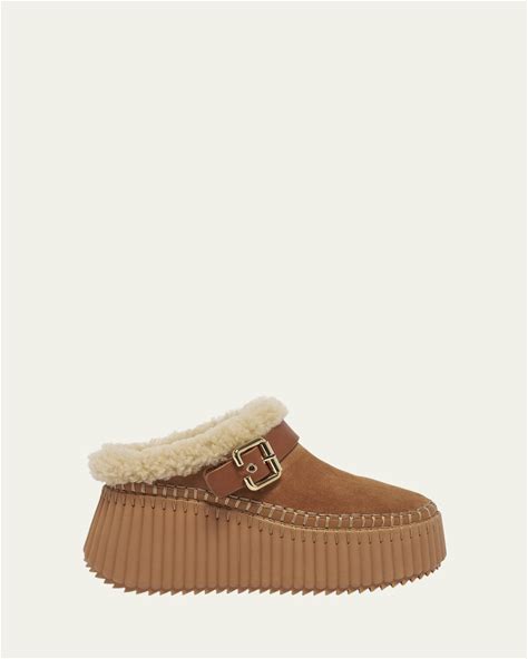Chloe Nama Suede Shearling-Lined Platform Clogs, Pottery Brown, Women's, 38 (8), Boots Shearling & Suede Sherpa Boots