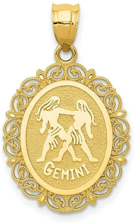 Real 14Kt Yellow Gold Solid Satin Polished Gemini Zodiac Oval Pendant