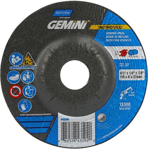 Norton | Gemini® Depressed-Center Wheel: Type 27, 4-1/2" Dia, 1/4" Thick, 7/8" Hole, Aluminum Oxide - 24 Grit, Resinoid Bond, 13580 Max RPM | 5-Pack