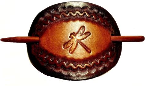 LEATHER STICK BARRETTE, HAIR BARRETTE, PONYTAIL HOLDER, HAIR CLIP, HAIR ACCESSORIES, PONYTAIL CLIPS, DRAGON FLY ON MED BROWN, DARK BROWN EDGE