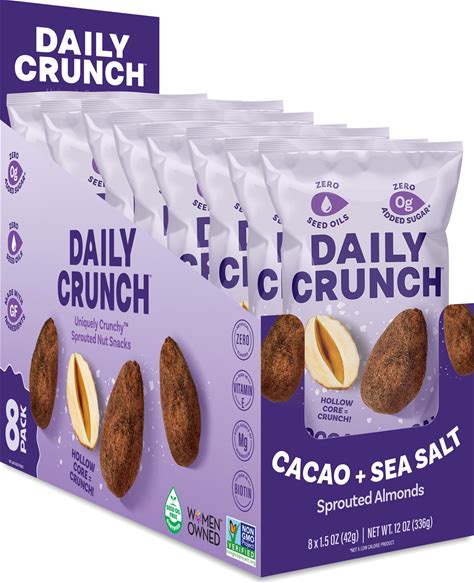 Daily Crunch Snacks Sprouted Almonds, Cacao & Sea Salt Snack Packs 8 Pouches (1.5 Oz Each)