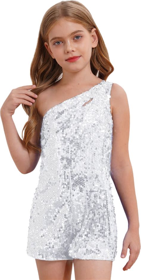 Ocealan Girls Sparkly One Piece Bodysuit Leotard Romper Junior Single Shoulder Sleeveless Shorty Jumpsuit Pageant Party