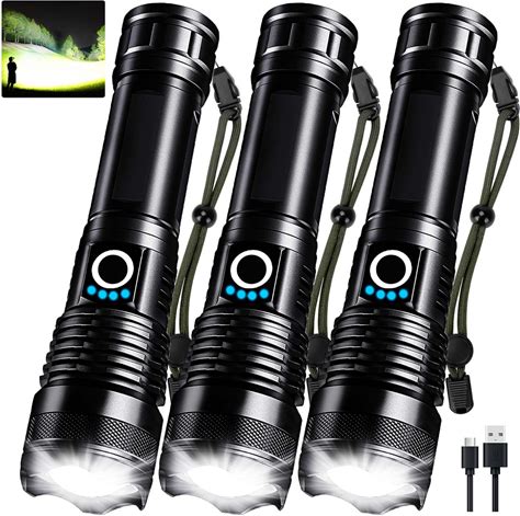 3 Pack Rechargeable LED Flashlights High Lumens, 90,000LM Super Bright Flashlight, Adjustable 5 Modes Powerful Flash Light With USB Cable, Waterproof