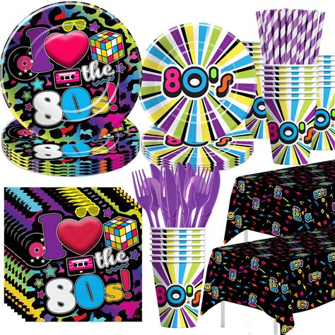 HIPVVILD 80'S Party Decorations Tableware - 80'S Theme Party Supplies Include Paper Plate, Cups, Napkins, Tablecloth, Cutlery, Straws, 80S Birthday