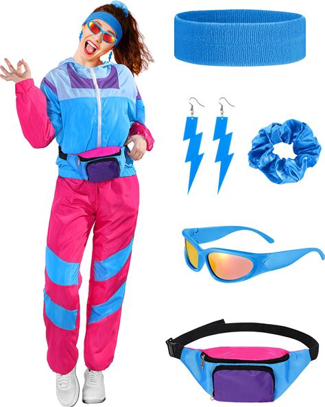 Ramede 80S Outfits For Women 90S Workout Halloween Costume Neon Wear Tracksuit Windbreaker Disco Party Accessories