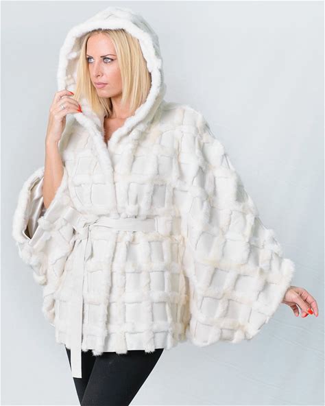 Hooded White Mink Fur Cape With Cross Pattern