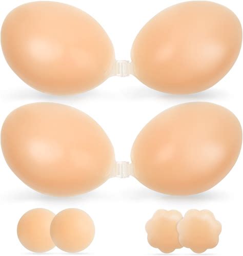 2 Pairs Strapless Sticky Adhesive Bra, Invisible Push Up Reusable Silicone Brassiere With Nipple Covers Nude