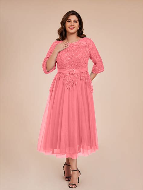 Elegant Illusion Lace Bodice 3/4 Sleeves Belted Tea Length Tulle Mother Of The Bride Dress, Watermelon