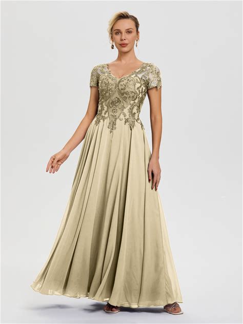 Champagne Mother Of The Bride Dress A-Line Short Sleeves Lace Appliques Sequins Maxi Mother Of The Bride Dress